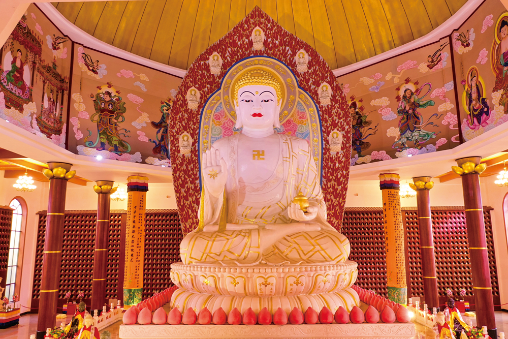園內(nèi)的南山大玉佛殿由玉佛大殿、藥師壇城、舍利殿組成,玉佛殿內(nèi)供奉的緬甸玉藥師如來,像高13.66米,重達(dá)660余噸。為目前國內(nèi)最大、最高的玉佛造像,大玉佛周圍供奉不同顏色的藥師六如來像,與大玉佛共同構(gòu)成藥師經(jīng)法上稱的藥師七佛。園內(nèi)還建有熱帶雨林植物園、農(nóng)博園、石窟、觀音洞及觀光索道纜車等。2003年7月,園區(qū)被命名為“中學(xué)歷史教學(xué)實(shí)景基地”和“青少年愛國主義教育基地”。