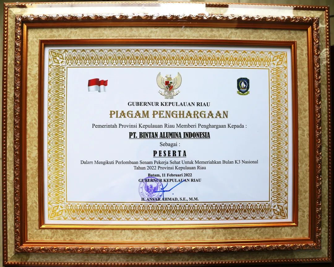 印尼賓坦氧化鋁公司榮獲廖內(nèi)群島省“高度遵守BPJS企業(yè)獎”和“安全生產(chǎn)月優(yōu)秀組織獎”