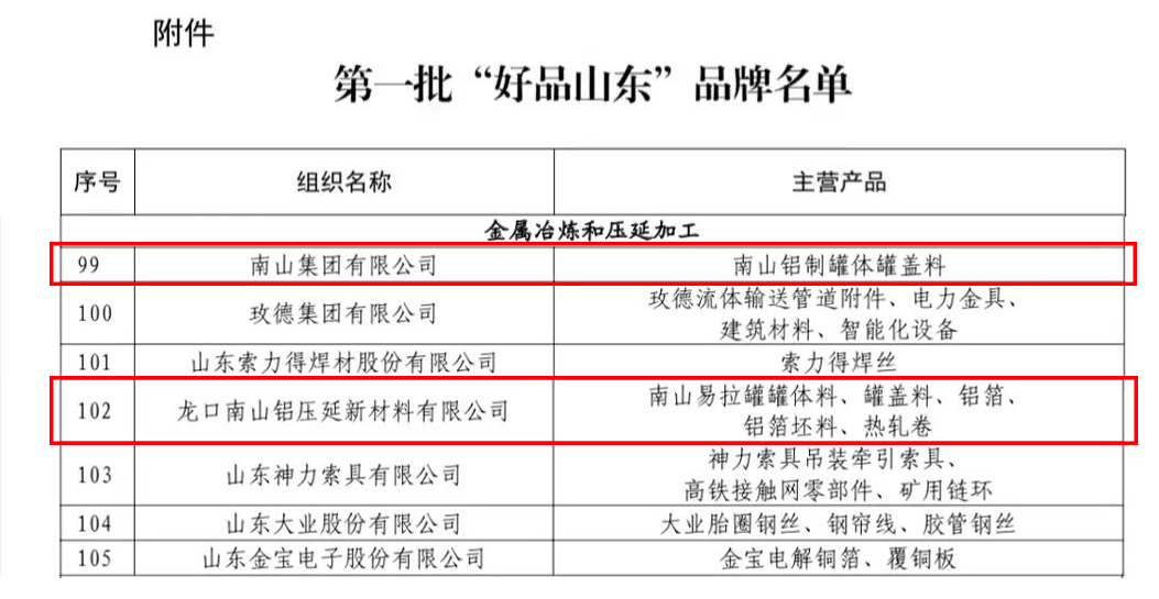 南山集團有限公司、龍口南山鋁壓延新材料有限公司入選第一批“好品山東” 名單!