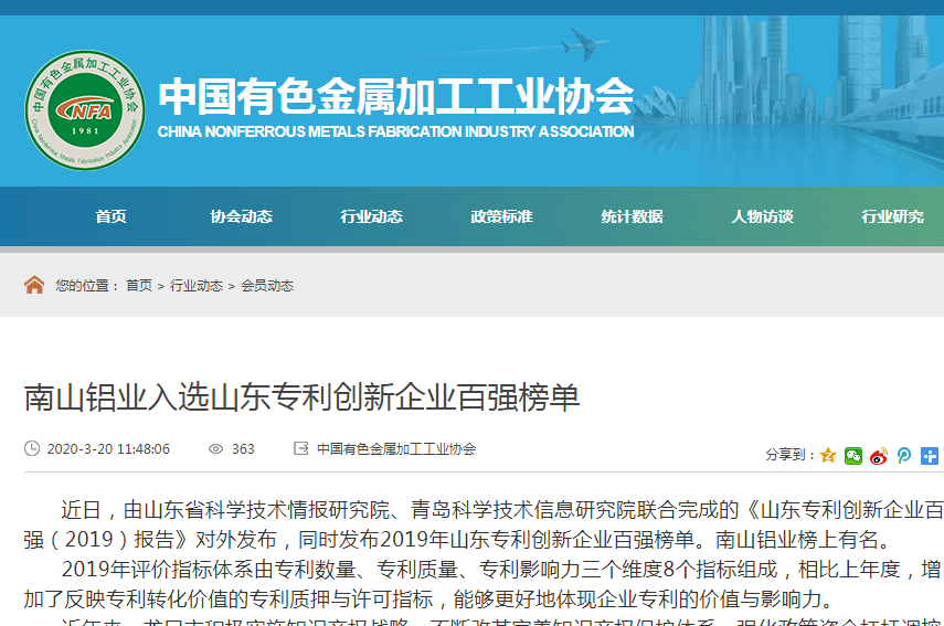 南山鋁業(yè)入選山東專利創(chuàng)新企業(yè)百強(qiáng)-中國有色金屬加工工業(yè)協(xié)會