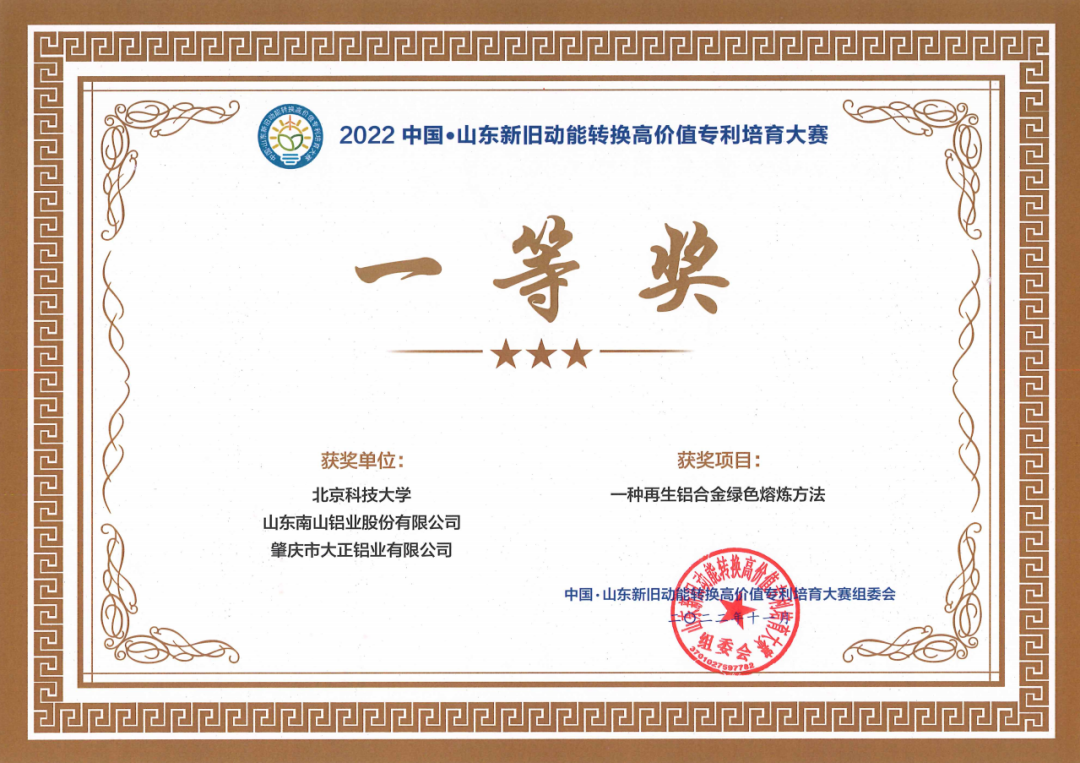 日前,山東南山鋁業(yè)股份有限公司與北京科技大學、肇慶市大正鋁業(yè)有限公司等單位聯(lián)合申報的“一種再生鋁合金綠色熔煉方法”項目獲得中國·山東新舊動能轉換高價值專利培育大賽組委會頒發(fā)的一等獎證書。