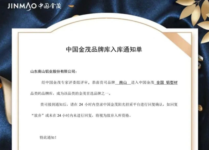 近日,南山鋁材以優(yōu)質的品牌口碑、領先的技術優(yōu)勢、完善的配套服務,成功入庫中國金茂全國鋁型材品牌庫,這是對南山鋁材綜合實力的又一次肯定。