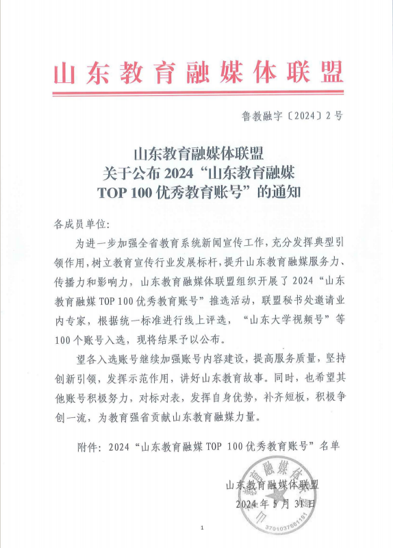 煙臺(tái)南山學(xué)院榮獲2024“山東教育融媒TOP100優(yōu)秀教育賬號(hào)”