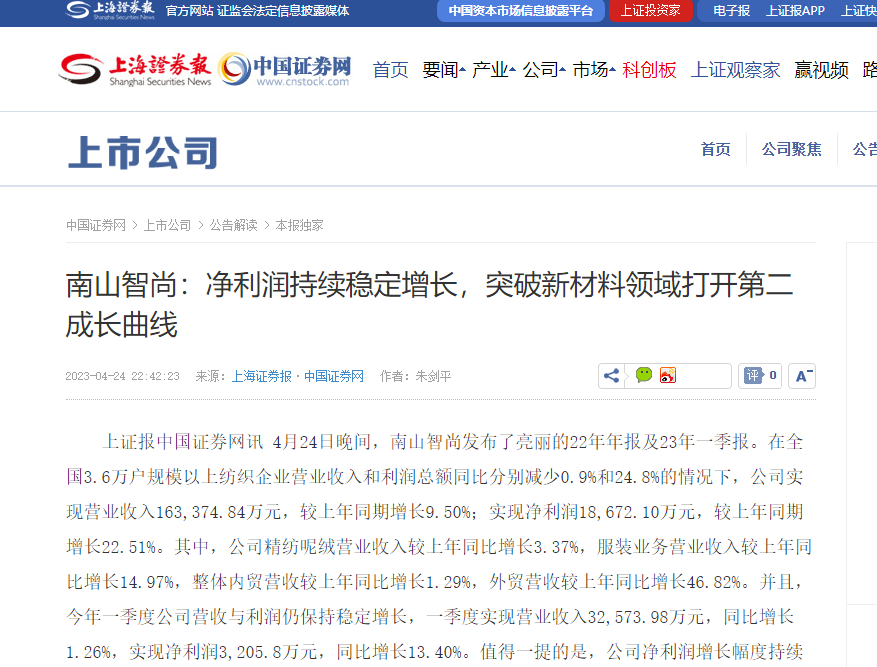 中國證券網(wǎng):南山智尚凈利潤持續(xù)穩(wěn)定增長,突破新材料領(lǐng)域打開第二成長曲線