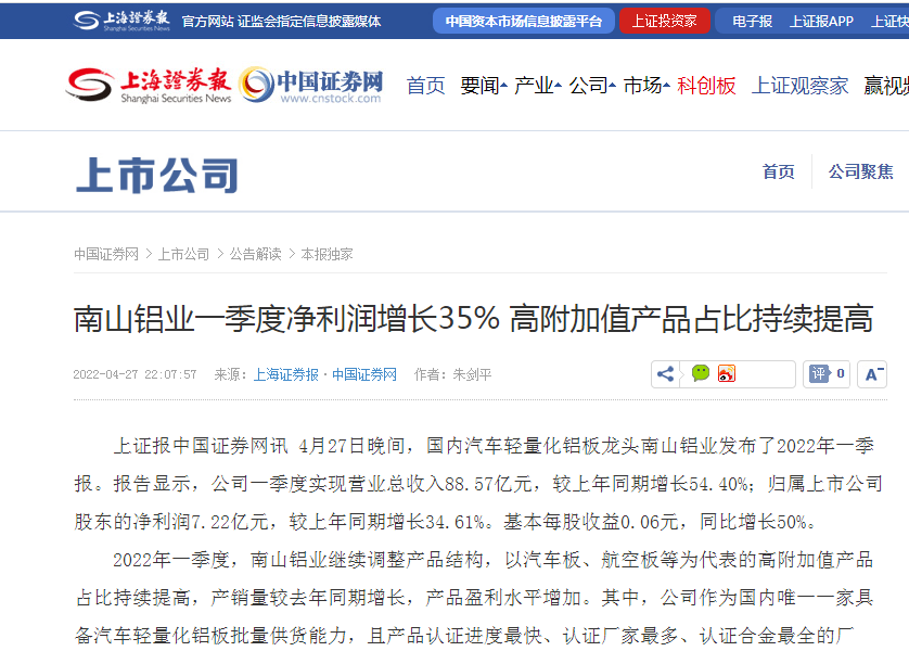 南山鋁業(yè)一季度凈利潤增長35% 高附加值產(chǎn)品占比持續(xù)提高-中國證券網(wǎng)