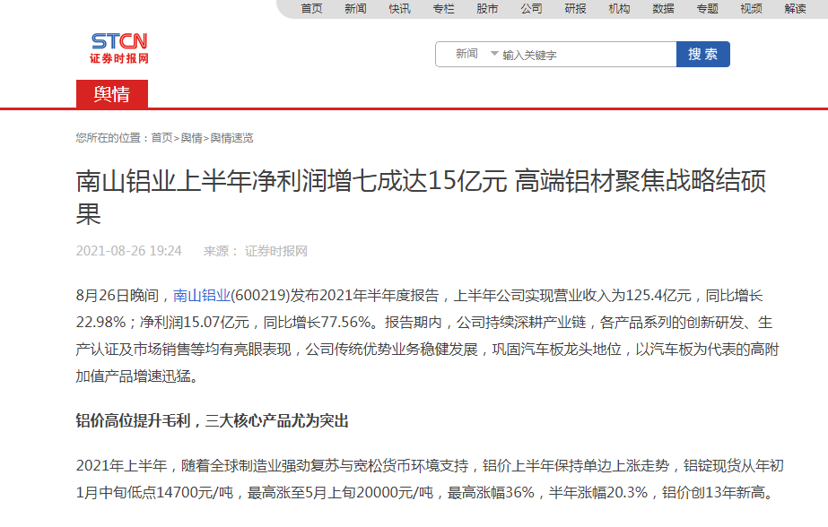 南山鋁業(yè)上半年凈利潤(rùn)增七成達(dá)15億元-證券時(shí)報(bào)