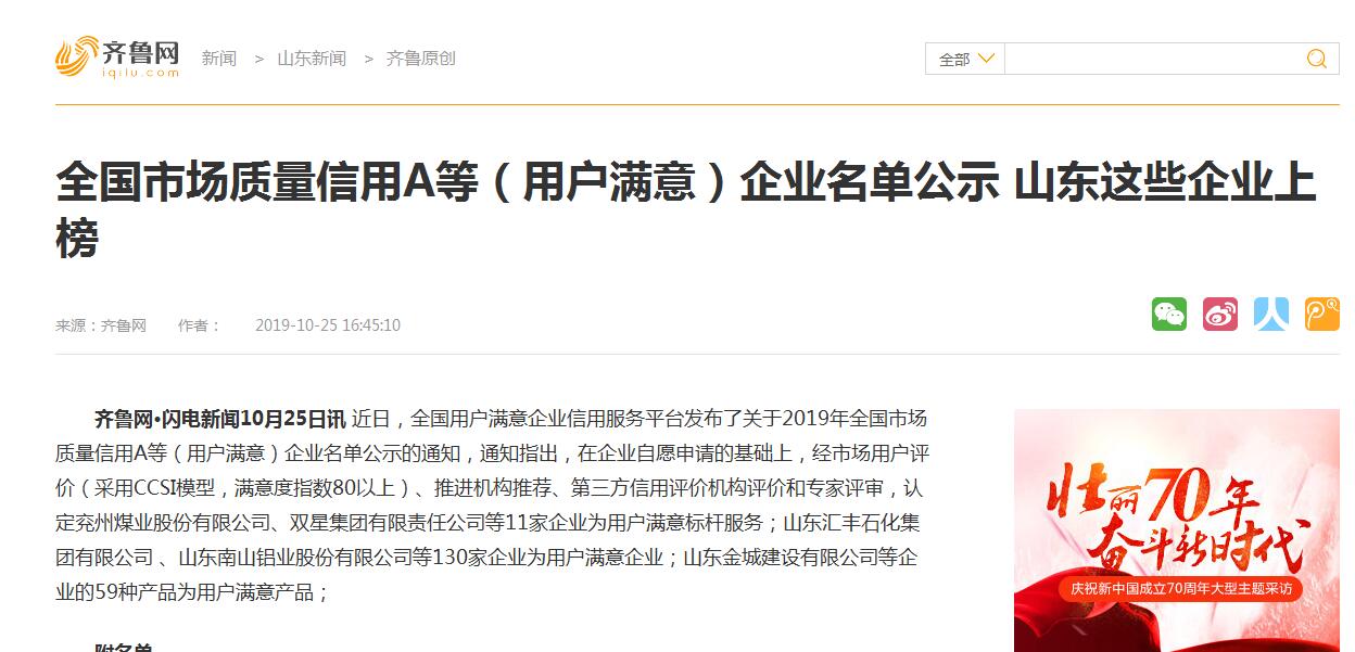 近日,全國用戶滿意企業(yè)信用服務平臺發(fā)布了關于2019年全國市場質量信用A等(用戶滿意)企業(yè)名單公示的通知,通知指出,在企業(yè)自愿申請的基礎上,經市場用戶評價(采用CCSI模型,滿意度指數(shù)80以上)、推進機構推薦、第三方信用評價機構評價和專家評審,認定兗州煤業(yè)股份有限公司、雙星集團有限責任公司等11家企業(yè)為用戶滿意標桿服務;山東匯豐石化集團有限公司 、山東南山鋁業(yè)股份有限公司等130家企業(yè)為用戶滿意企業(yè);山東金城建設有限公司等企業(yè)的59種產品為用戶滿意產品;