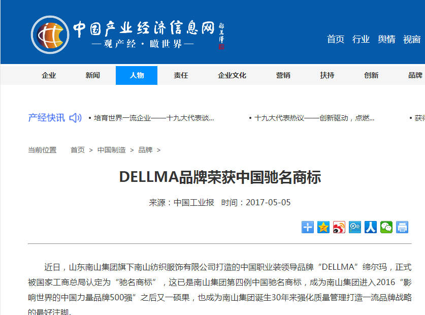南山紡織服飾公司DELLMA品牌獲評(píng)中國馳名商標(biāo)-中國產(chǎn)經(jīng)新聞