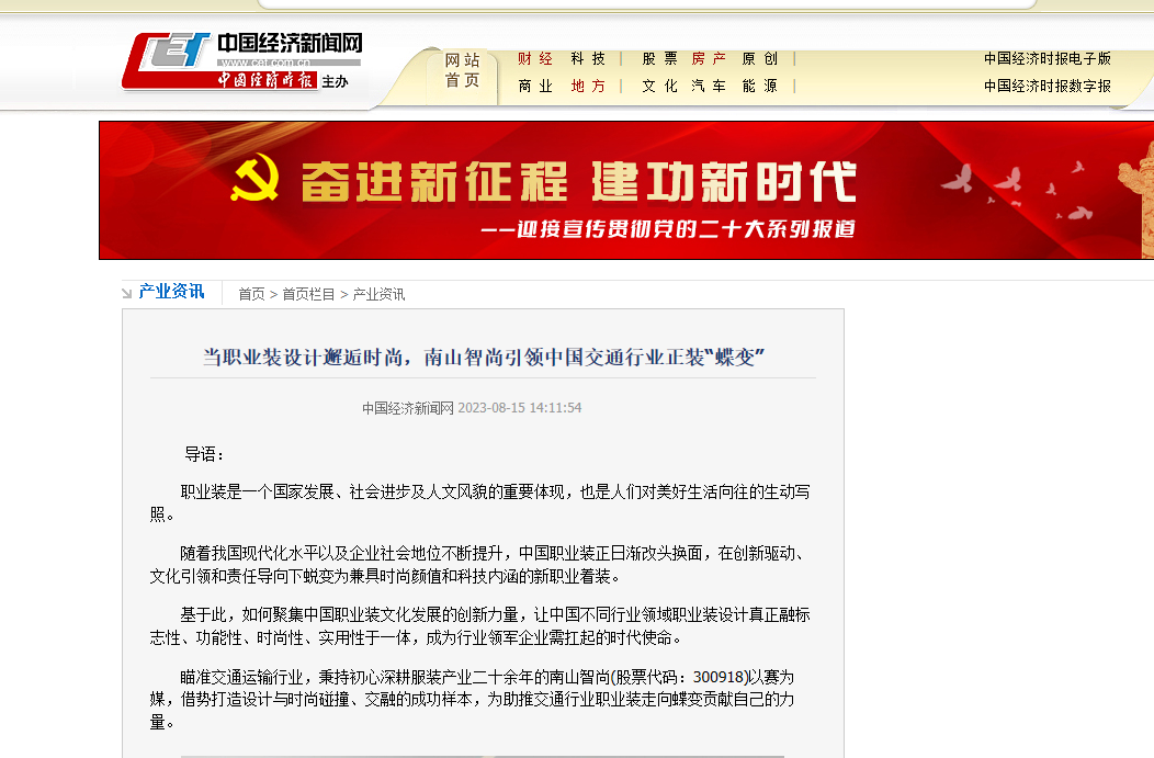 中國經(jīng)濟(jì)新聞網(wǎng):當(dāng)職業(yè)裝設(shè)計(jì)邂逅時(shí)尚,南山智尚引領(lǐng)中國交通行業(yè)正裝“蝶變”