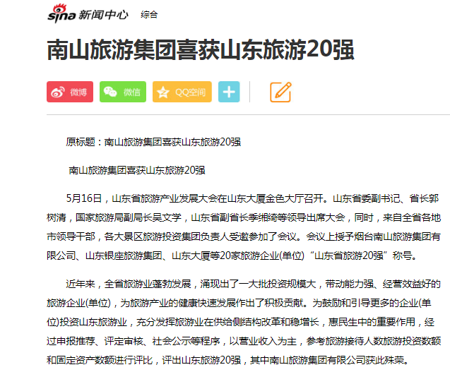 南山旅游集團(tuán)喜獲山東旅游20強(qiáng)-新浪網(wǎng)