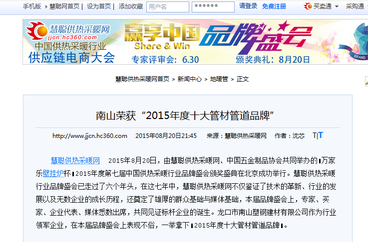 南山榮獲“2015年度十大管材管道品牌” -慧聰網(wǎng)
