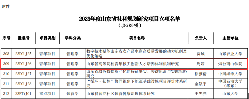 近日,山東省哲學(xué)社會(huì)科學(xué)工作辦公室發(fā)布2023年度山東省社科規(guī)劃研究項(xiàng)目立項(xiàng)項(xiàng)目名單,經(jīng)過(guò)通訊初評(píng)、會(huì)議評(píng)審,煙臺(tái)南山學(xué)院青年教師周婷申報(bào)的“山東省高等院校青年拔尖創(chuàng)新人才培養(yǎng)體制機(jī)制研究”喜獲立項(xiàng),位居山東省同類院校前列,學(xué)校也成為煙臺(tái)市唯一民辦高校立項(xiàng)單位。