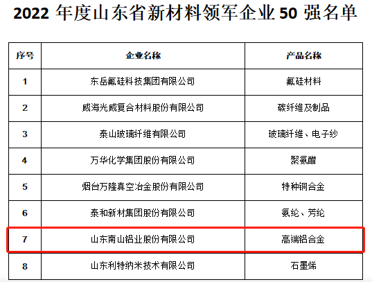 5月19日,山東省工信廳發(fā)布《關(guān)于公布2022年度山東省新材料領(lǐng)軍企業(yè)培育庫入庫名單和50強(qiáng)名單的通知》,確定262家企業(yè)為2022年度山東省新材產(chǎn)領(lǐng)軍企業(yè)培育庫入庫企業(yè),其中,山東南山鋁業(yè)股份有限公司入選2022年度山東省新材料領(lǐng)軍企業(yè)培育庫入庫名單,并位列50強(qiáng)前列。