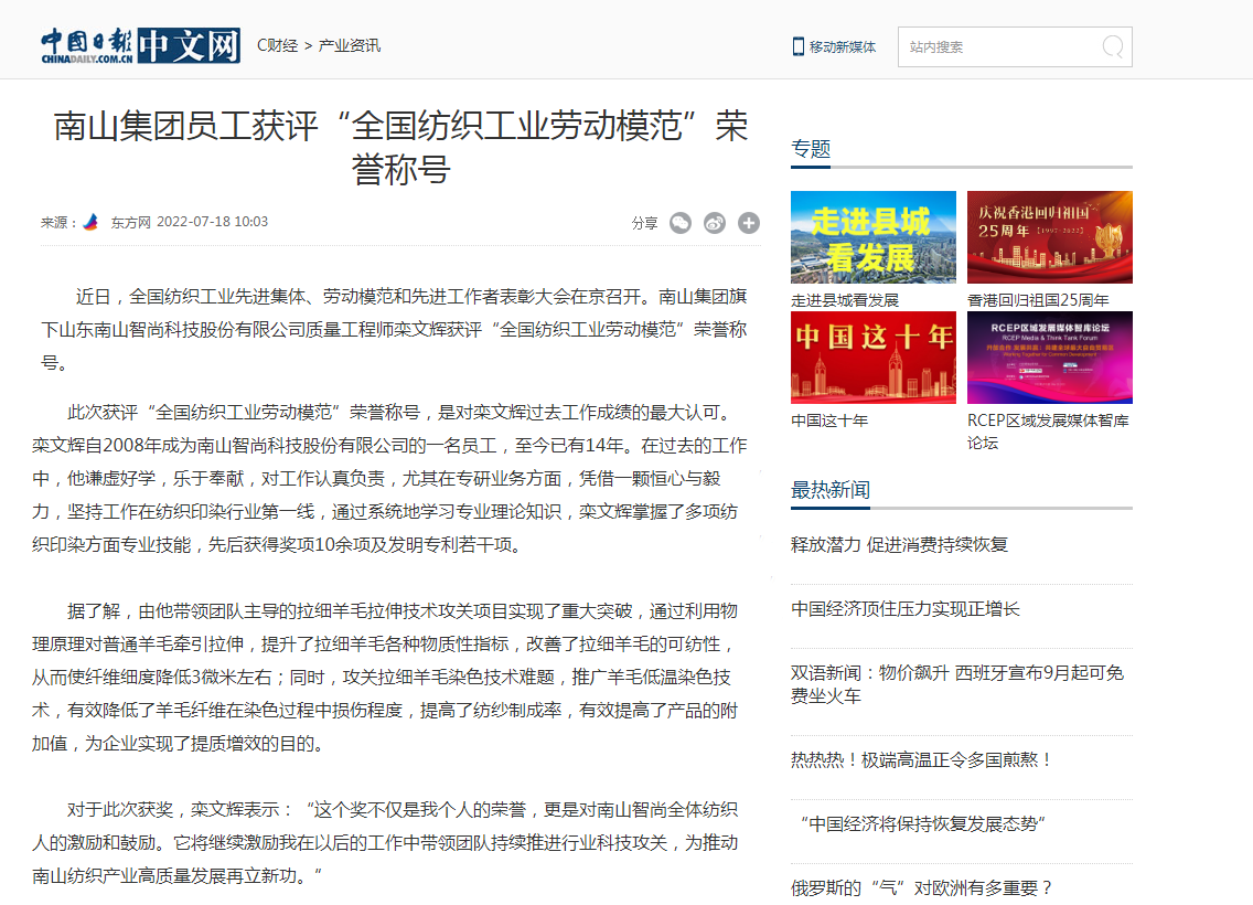 中國日報:南山集團(tuán)員工獲評“全國紡織工業(yè)勞動模范”榮譽(yù)稱號