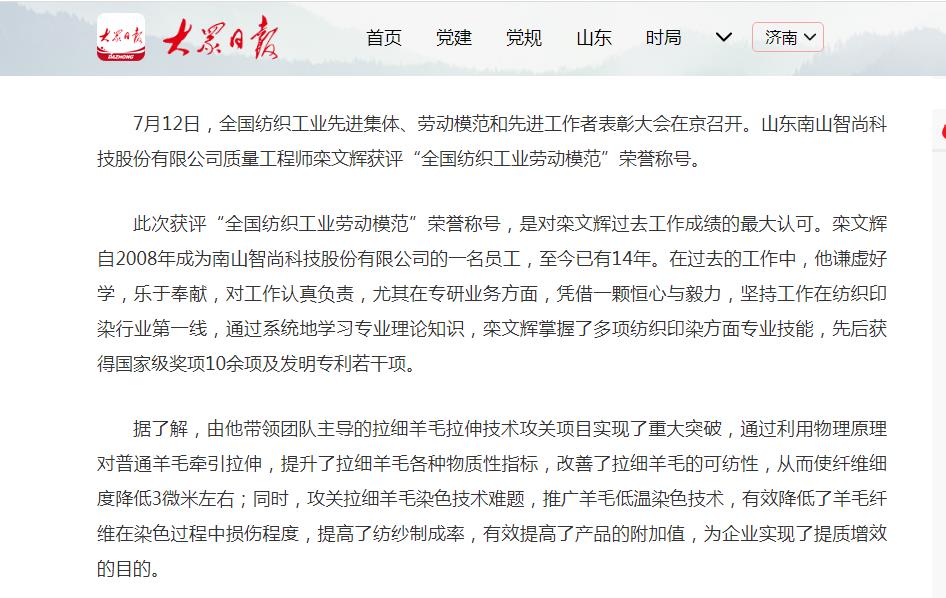 大眾日報:祝賀!南山智尚欒文輝獲評“全國紡織工業(yè)勞動模范”榮譽(yù)稱號