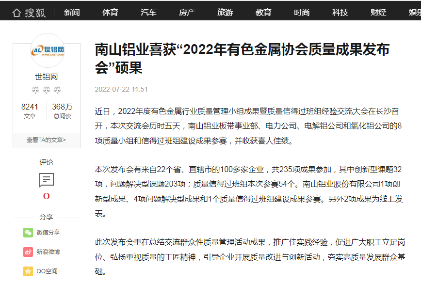 世鋁網(wǎng):南山鋁業(yè)喜獲“2022年有色金屬協(xié)會質(zhì)量成果發(fā)布會”碩果