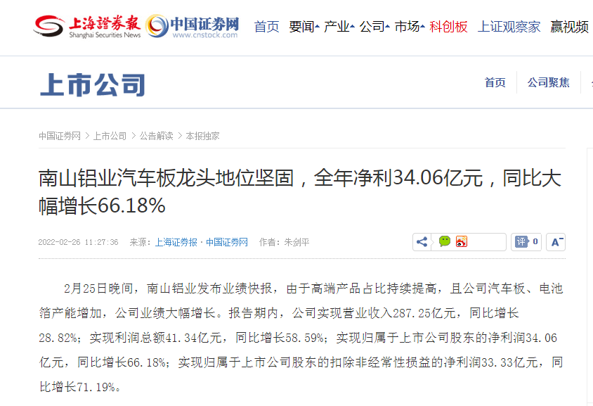 2月25日晚間,南山鋁業(yè)發(fā)布業(yè)績快報,由于高端產(chǎn)品占比持續(xù)提高,且公司汽車板、電池箔產(chǎn)能增加,公司業(yè)績大幅增長。報告期內(nèi),公司實現(xiàn)營業(yè)收入287.25億元,同比增長28.82%;實現(xiàn)利潤總額41.34億元,同比增長58.59%;實現(xiàn)歸屬于上市公司股東的凈利潤34.06億元,同比增長66.18%;實現(xiàn)歸屬于上市公司股東的扣除非經(jīng)常性損益的凈利潤33.33億元,同比增長71.19%。