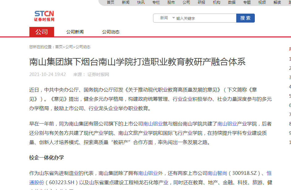 煙臺南山學(xué)院打造職業(yè)教育教研產(chǎn)融合體系-證券時報(bào)