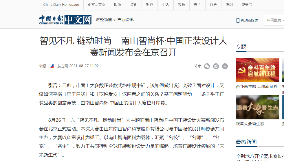 26日,南山智尚杯·中國正裝設(shè)計(jì)大賽在北京正式啟動(dòng)。記者在大賽啟動(dòng)發(fā)布會(huì)上了解到,本屆大賽以“時(shí)尚、創(chuàng)意、科技、原創(chuàng)多維度交融”為主旨,意在挖掘正裝設(shè)計(jì)文化高度的同時(shí),為中國青年時(shí)尚設(shè)計(jì)師搭建展示夢(mèng)想與走向國際市場的舞臺(tái)。多位業(yè)內(nèi)人士也在發(fā)布會(huì)上對(duì)行業(yè)的轉(zhuǎn)型升級(jí)趨勢發(fā)表了見解。