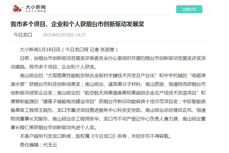 南山鋁業(yè)的“大規(guī)格高性能航空鋁合金板材關(guān)鍵技術(shù)開發(fā)及產(chǎn)業(yè)化”和中宇機械的“電磁調(diào)速水泵”獲煙臺市科技創(chuàng)新成果獎;南山鋁業(yè)、道恩高分子材料、南山旅游、恒通物流獲煙臺市創(chuàng)新驅(qū)動領(lǐng)軍企業(yè)獎;南山鋁業(yè)的“航空航天用高強度高韌高端鋁合金生產(chǎn)線技術(shù)改造項目”和德晉新能源的“鋰離子儲能電池建設(shè)項目”獲煙臺市新舊動能轉(zhuǎn)換十佳示范項目獎;中際智能裝備高級工程師王曉東、龍口市重點項目推進服務(wù)中心科員史世凱、南山鋁業(yè)總經(jīng)理呂正風、恒通物流董事長劉振東、南山鋁業(yè)總工程師張華、龍口市不動產(chǎn)登記中心負責人康力源、南山鋁業(yè)董事長程仁策獲煙臺市創(chuàng)新驅(qū)動先進個人獎。