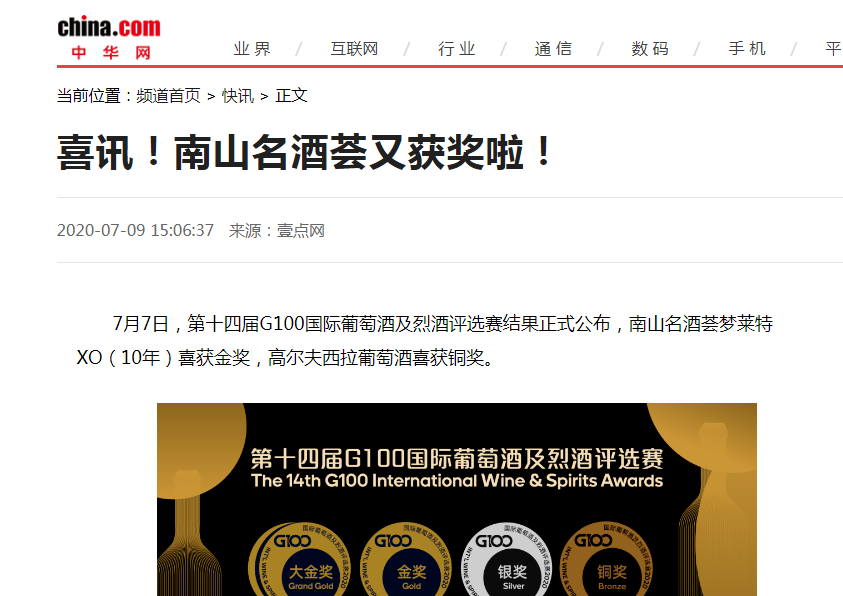 7月7日,第十四屆G100國(guó)際葡萄酒及烈酒評(píng)選賽結(jié)果正式公布,南山名酒薈夢(mèng)萊特XO(10年)喜獲金獎(jiǎng),高爾夫西拉葡萄酒喜獲銅獎(jiǎng)。