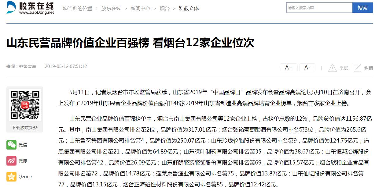 山東民營品牌價值企業(yè)百強榜 看煙臺12家企業(yè)位次-膠東在線