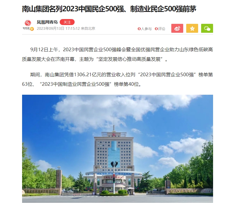 鳳凰網(wǎng):南山集團(tuán)名列中國(guó)民企500強(qiáng)、制造業(yè)民企500強(qiáng)前茅