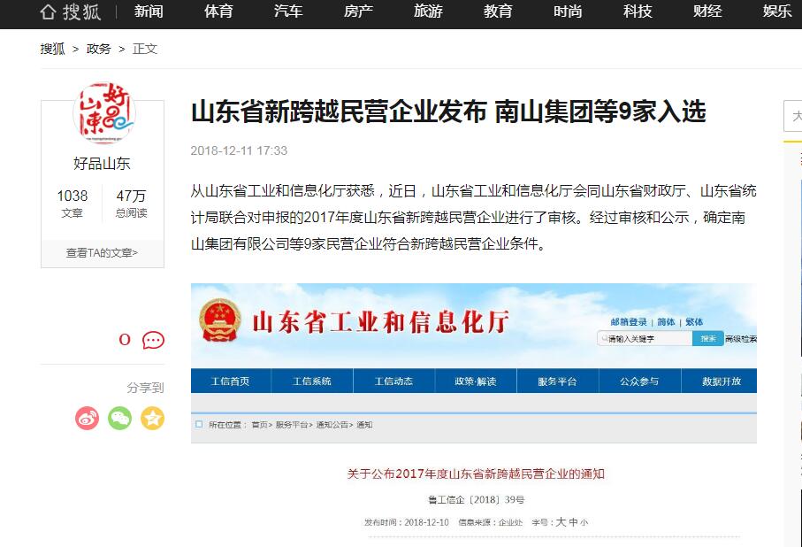 從山東省工業(yè)和信息化廳獲悉,近日,山東省工業(yè)和信息化廳會同山東省財政廳、山東省統(tǒng)計局聯(lián)合對申報的2017年度山東省新跨越民營企業(yè)進行了審核。經(jīng)過審核和公示,確定南山集團有限公司等9家民營企業(yè)符合新跨越民營企業(yè)條件。