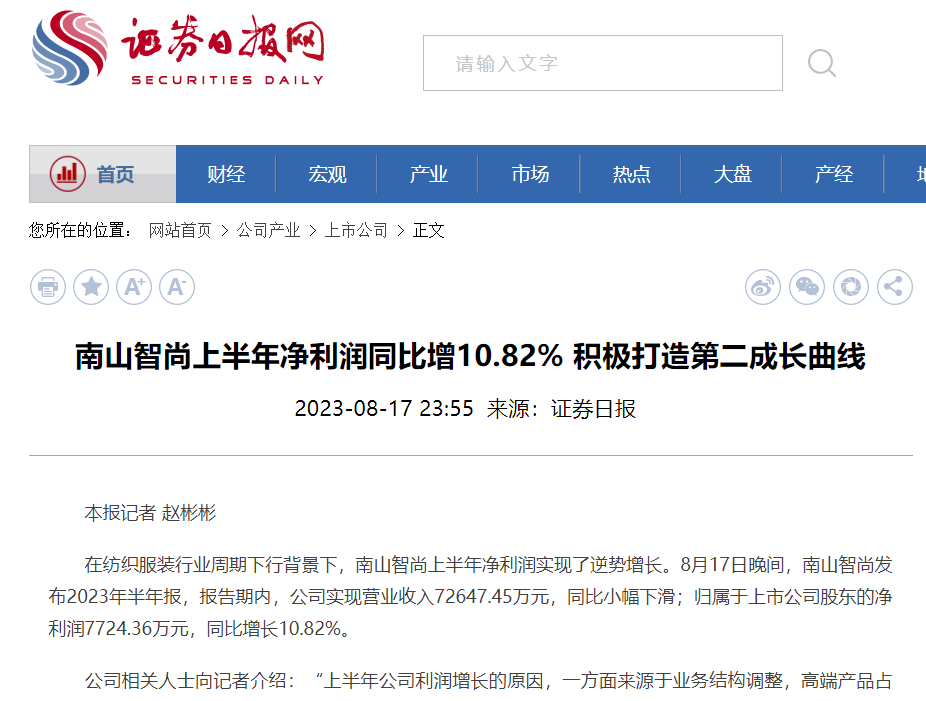 證券日報:南山智尚上半年凈利潤同比增10.82% 積極打造第二成長曲線