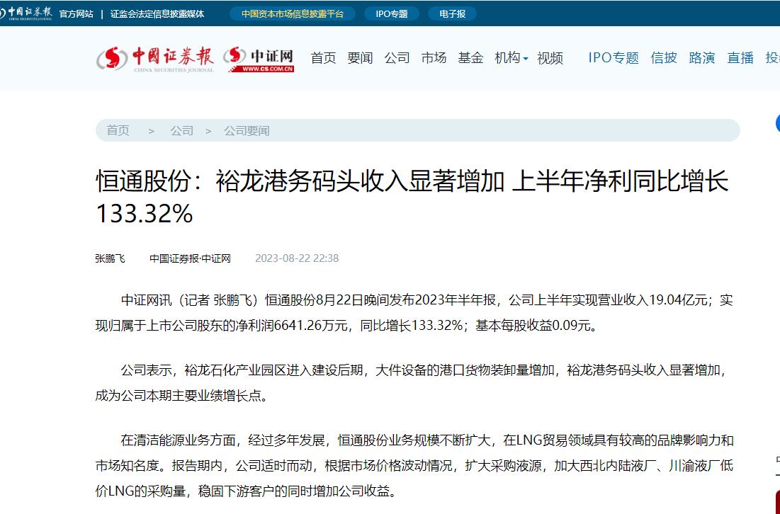 中國證券網(wǎng):恒通股份上半年凈利同比增長133.32%