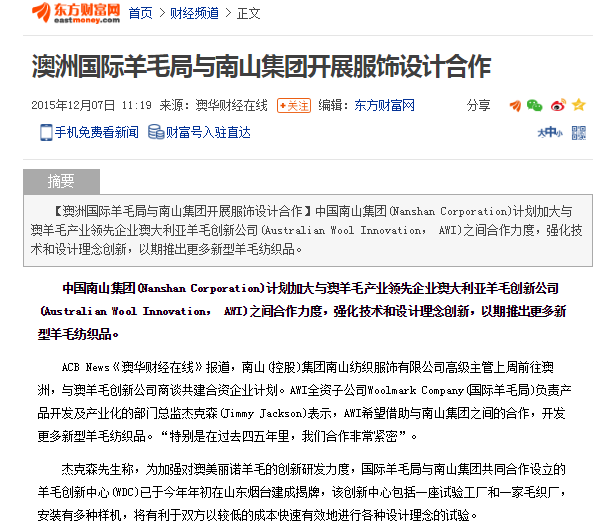 澳洲國際羊毛局與南山集團(tuán)開展服飾設(shè)計合作-東方財富網(wǎng)